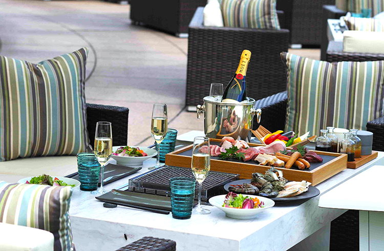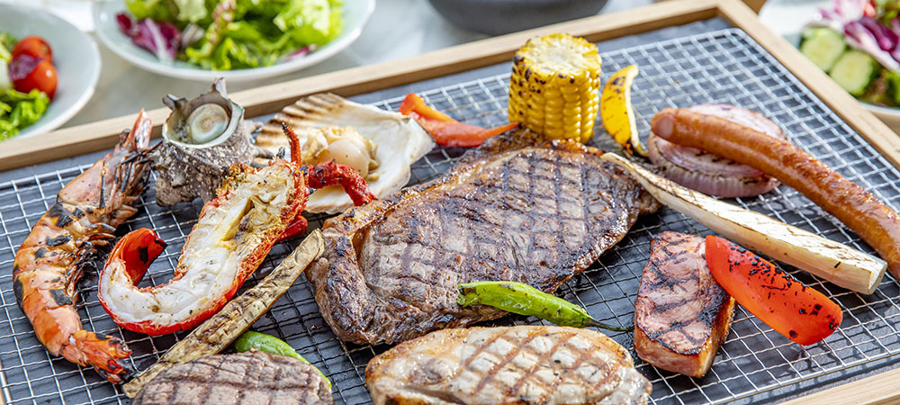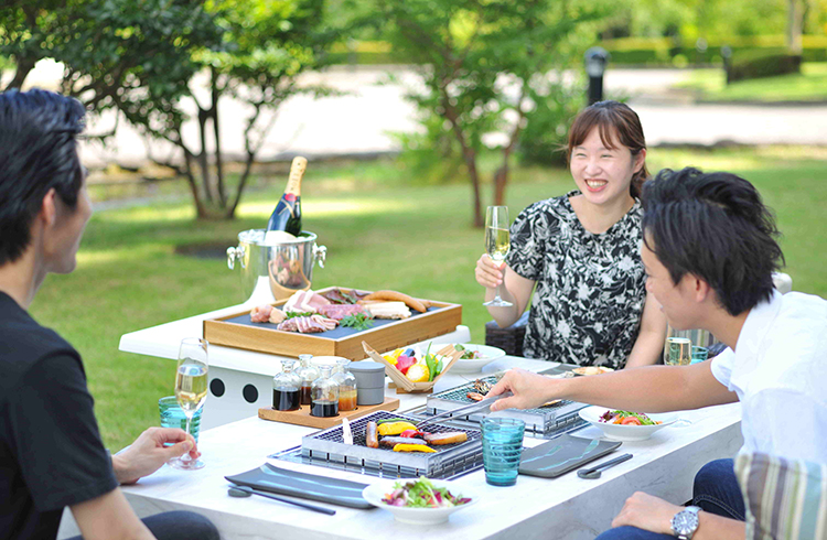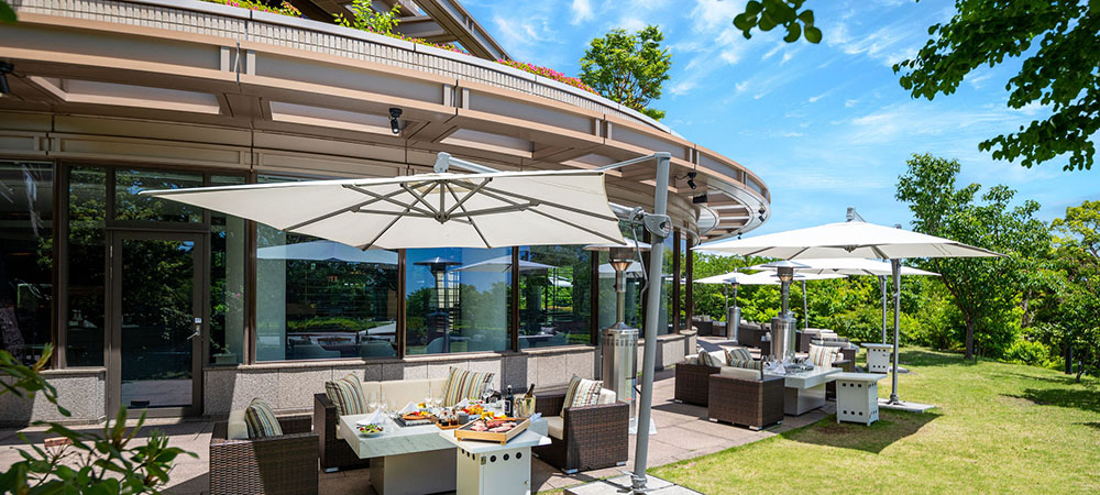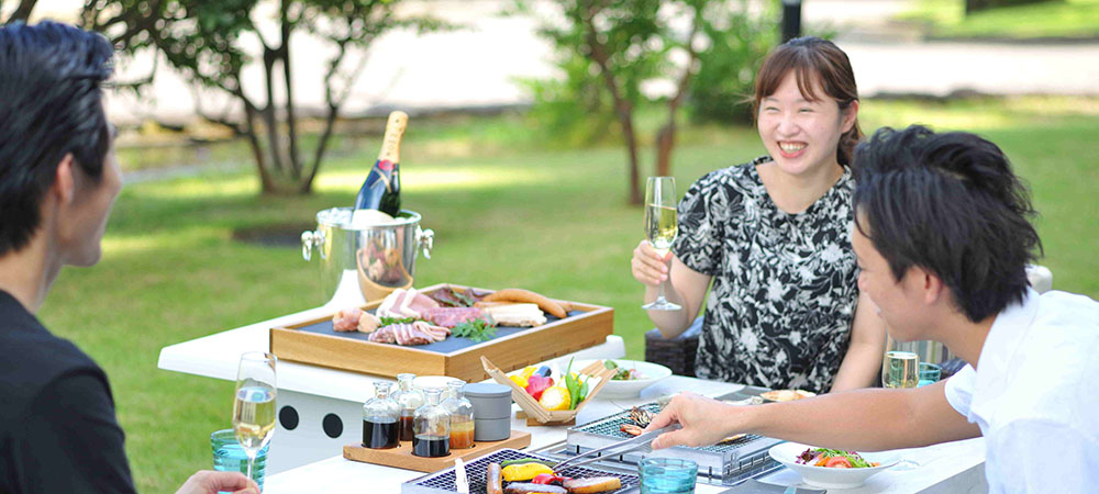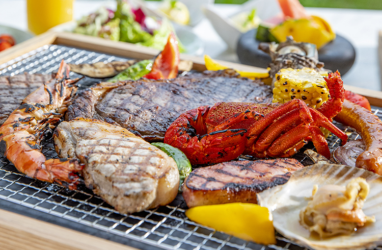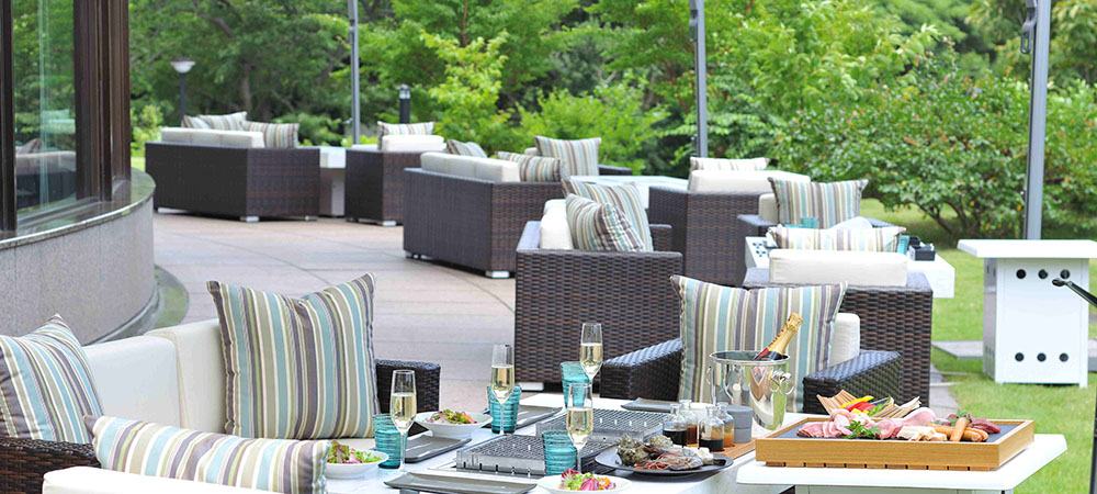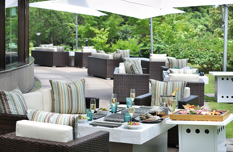 1Fブラッセリー「フローラ」の開放的なテラス席でBBQをお楽しみいただけます。料理長厳選の上質なお肉や魚介類をたっぷりご堪能いただける大人BBQです。最大35名様までご利用いただけます。