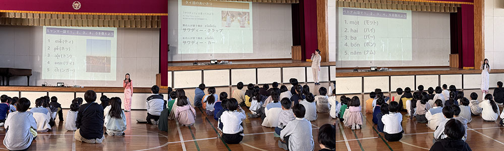 今年も片浦小学校で異文化交流会を行いました。ミャンマー、ベトナム、タイ出身のチームメンバー(従業員)が各国の数の数え方、動物の鳴き声表現の違い、じゃんけん、伝統的な遊びを通して、小学生たちと交流を深めました。