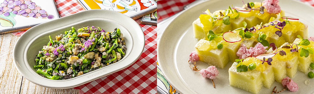 - あさりと菜の花、十五穀米の山葵和え または ホタテと大根の菊花和え(日替わり)