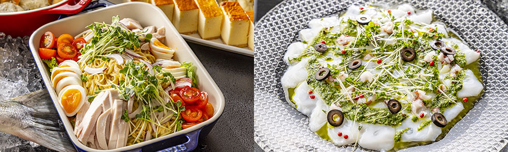 - 水蛸のカルパッチョ、香草とオリーブのソース または サーモンのグラブラックス 胡瓜とヨーグルトのサラダ添え(日替わり)