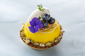 ムースの中心とタルトにはブルーベリーを使用し春らしいレモンイエローのグラサージュで華やかに仕上げています。