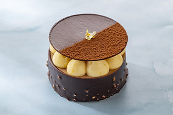 オレンジの表皮を加えたカスタードクリームと果肉感のあるジュレが清涼感を添え、ムースを包むチョコアーモンドの食感が味わいを際立たせます。