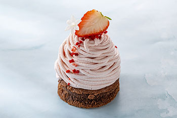 上品な甘さのチョコレートケーキに、苺ムースとミルクチョコムースを重ね、仕上げにはたっぷりの苺クリームでかわいらしいモンブランスタイルに。