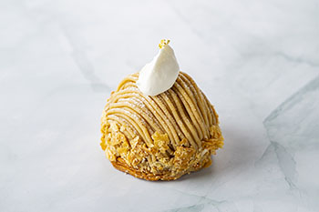 キャラメリゼした香ばしいパイの上に、なめらかなカスタードクリームとたっぷりの生クリームを重ね、渋皮栗の甘露煮を贅沢にトッピング。仕上げには熊本県阿蘇産の和栗をふんだんに使用した濃厚なモンブランクリームを絞った、秋冬限定の逸品。