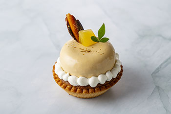全粒粉入りの香ばしいタルトに、アールグレイ茶葉を練り込んだクレームダマンドを絞り、林檎とともにじっくり焼き上げたベース。キャラメルグレーズで仕上げた紅茶ムースを重ね、ムースの中にはキャラメリゼした林檎のコンポートを忍ばせました。紅茶と林檎の優雅なハーモニーをご堪能ください。