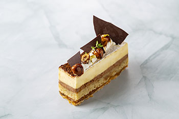 バニラムース、ヘーゼルナッツ風味を閉じ込めたジョコンド、ほろ苦いビターショコラのムースが層になり、全体を気品あるラムの香りが包み込みます。 仕上げにはキャラメリゼしたヘーゼルナッツをトッピング。大人の味わいが広がる、贅沢なチョコレートケーキです。