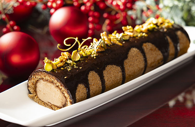 しっとり焼き上げたココアスポンジが、ベルギー産チョコレートの濃厚なクリームを丁寧に包みこむ一品。艶やかなグラッサージュとキャラメリゼしたナッツが星屑のように輝く、幻想的なクリスマスノエル。