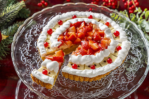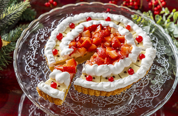 ラズベリーを散りばめた香ばしいタルトに、苺とクリームをたっぷりと。タルトの上に集合したサンタさんたちは、どこにプレゼントを届けるか相談中かも?