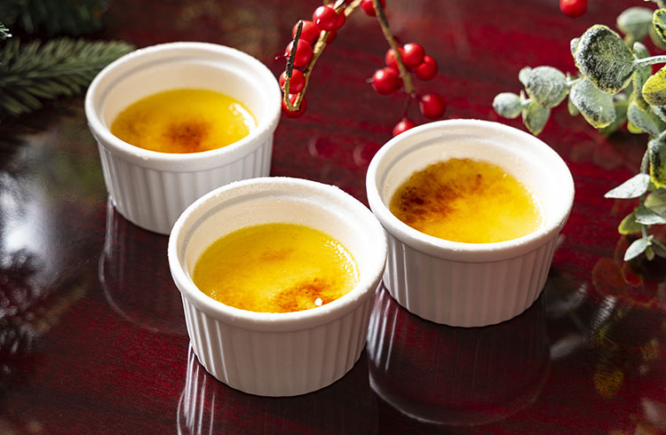 ほろ苦いキャラメリゼの下に広がる、ジンジャーブレッドのスパイスが香る濃厚なクリームブリュレ。シナモンやジンジャー、ナツメグなどクリスマスを彩る香りが雰囲気を盛り上げます。