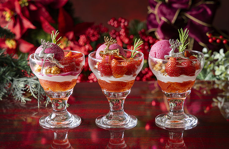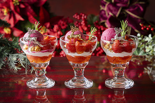 カシスシャーベットと苺がオーナメントのように鮮やかな赤を添え、ローズマリーのグリーンがもみの木を思わせる、華やかなクリスマス限定パフェ。グラスの底にはレモンゼリーと苺のソースが広がり、最後のひと口まで贅沢に楽しめます。