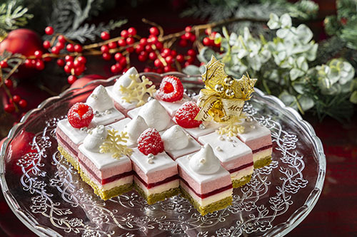 ピスタチオの深いコクと、ラズベリーの甘酸っぱさが重なるムースケーキ。ホワイトチョコの優しい甘さが全体を包み込む、冬の祝祭にふさわしい華やかさを楽しんで。