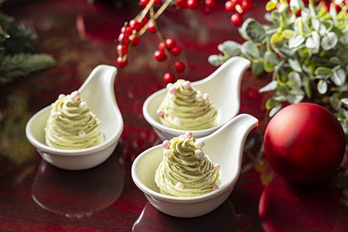 香ばしいピスタチオクリームと甘酸っぱいラズベリーを閉じ込めた、マカロンのツリーケーキ。見た瞬間に心が躍り、クリスマスのときめきを感じること間違いなし!
