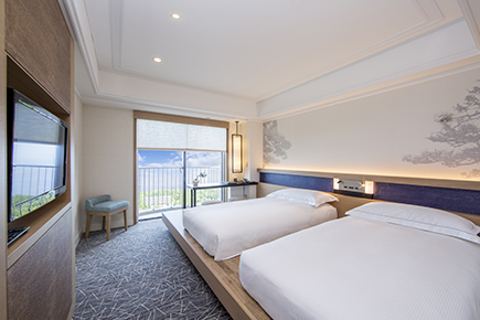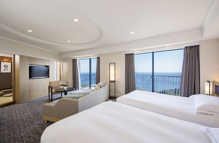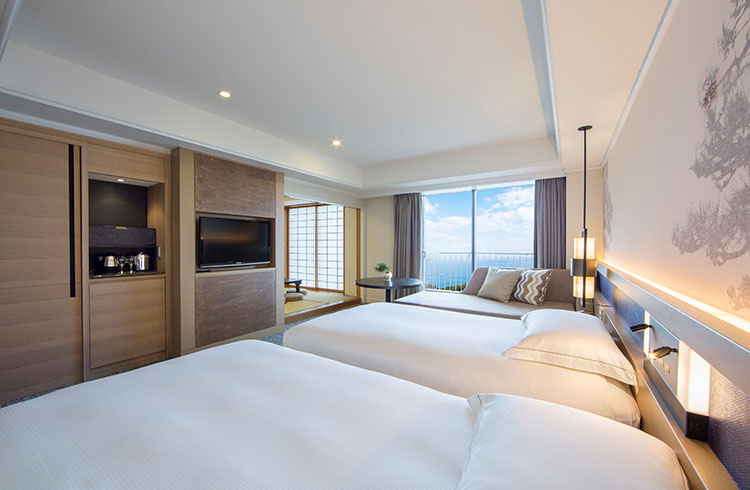 ツインベッドとソファセットが配された洋室と和室からなる広々とした空間。和室ではお布団をご利用いただけるため、赤ちゃんや小さなお子様も、ベッドから落ちる心配なく安心してご利用いただけます。
